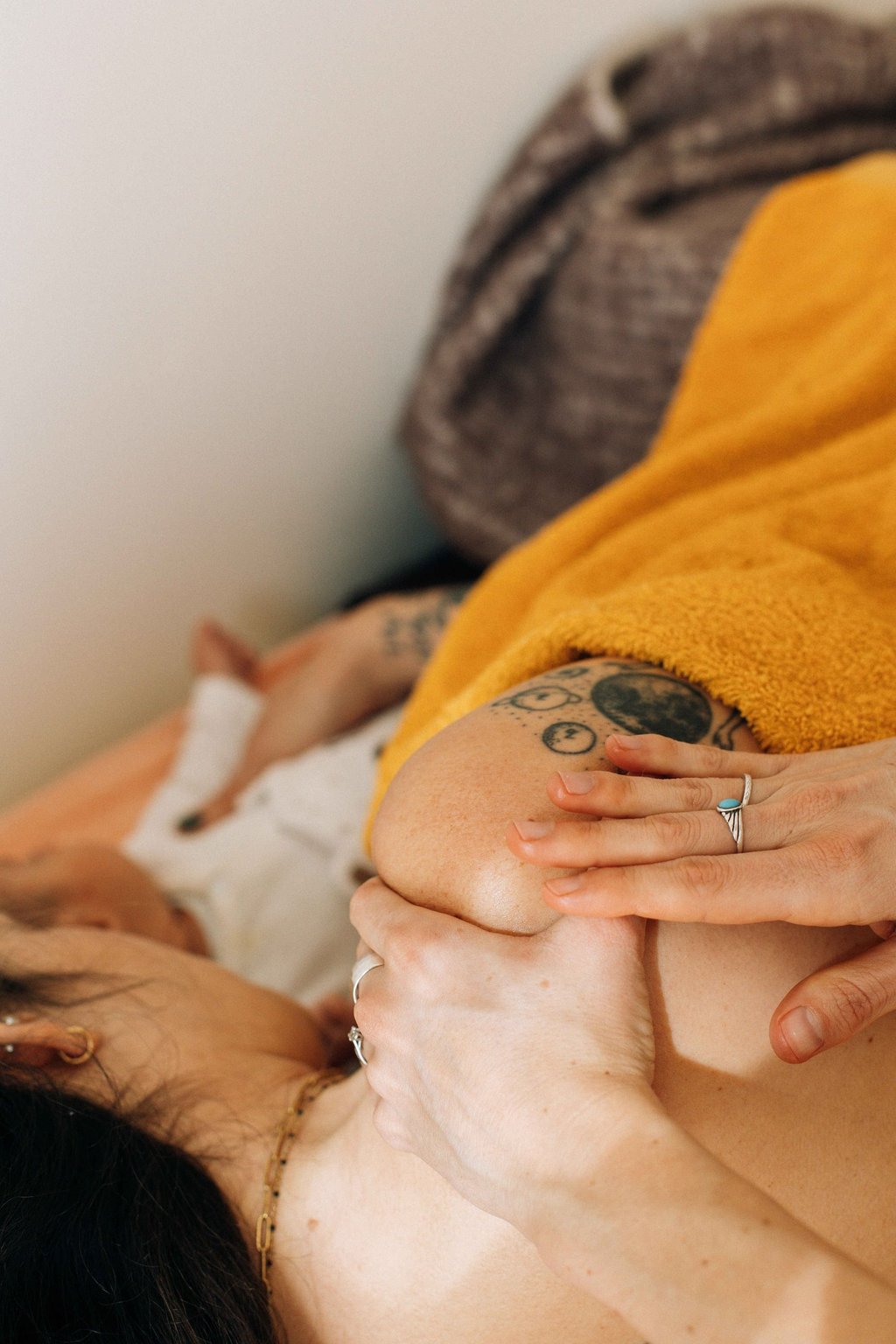 Le massage postnatal se fait tout en douceur, permettant à la maman de prendre un moment pour elle, se détendre, s'apaiser. Durant ce soin, je pratique un resserrage du bassin, technique issue du soin traditionnel rebozo. Réalisé avec une écharpe rebozo, il permet à la maman de se reconnecter à son corps et de resserrer la zone du bassin qui s'est ouverte d'un point de vue physique et énergétique au moment de la naissance de bébé.
